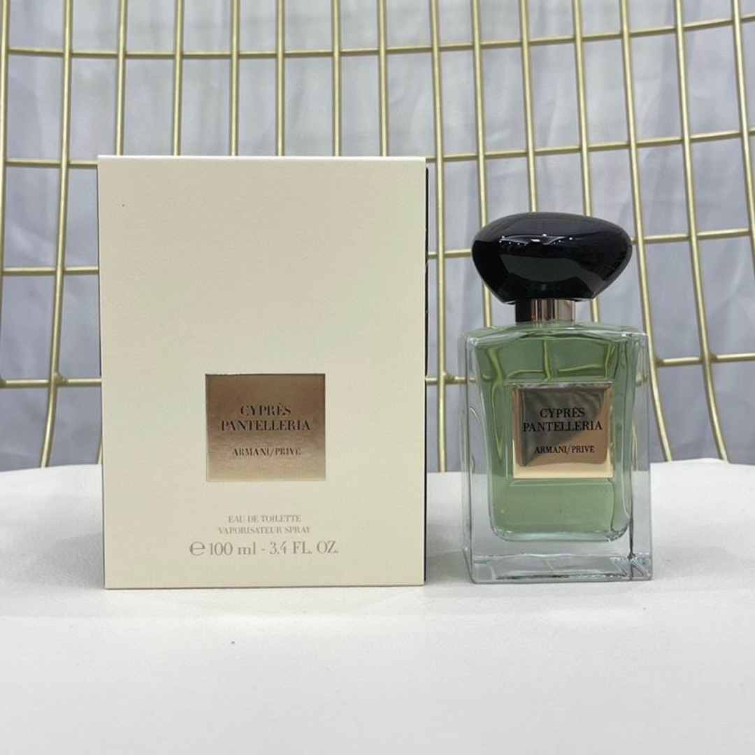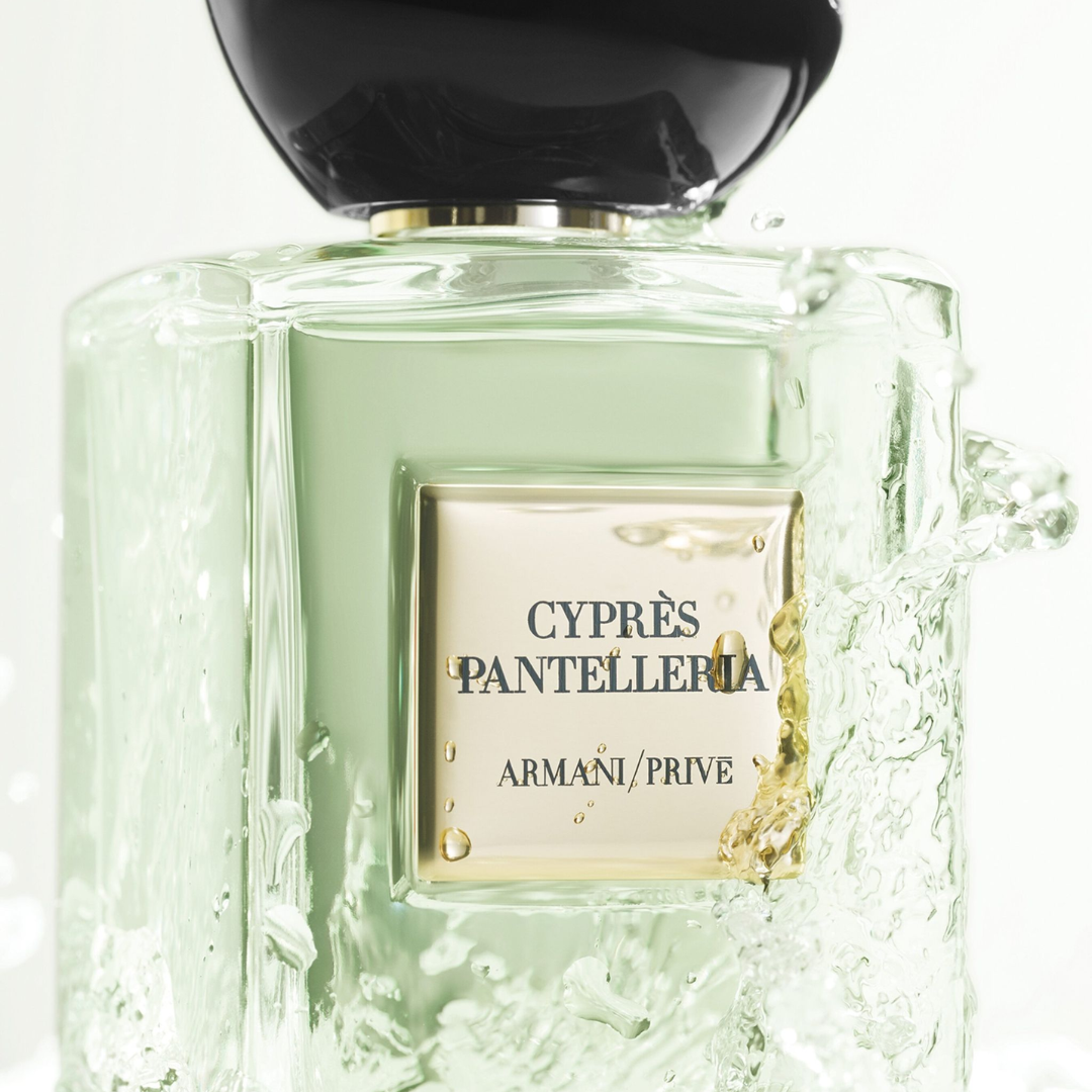 Cyprès Pantelleria é apresentado no icônico frasco de vidro transparente Armani / Privé com tampa preta.