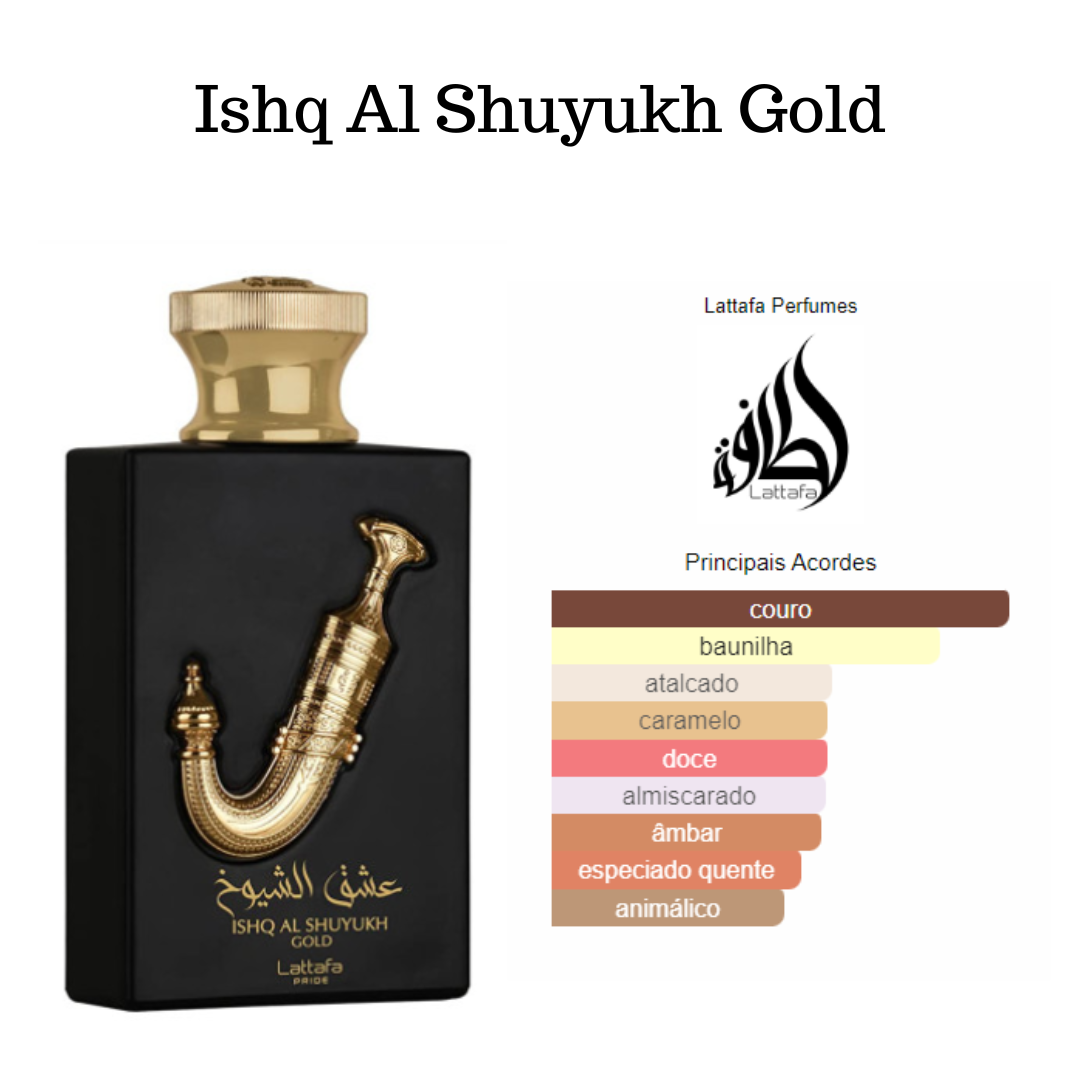 Ishq Al Shuyukh Gold de Lattafa Perfumes é um perfume Âmbar Baunilha Compartilhável. Esta é uma nova fragrância. Ishq Al Shuyukh Gold foi lançada em 2022. As notas de topo são: Caramelo e Açafrão. As notas de coração são: Camurça, Couro e Fava Tonka. As notas de fundo são: Baunilha, Âmbar e Almíscar.