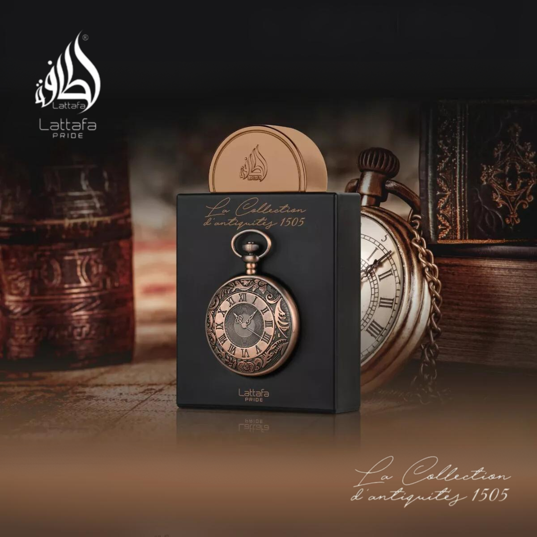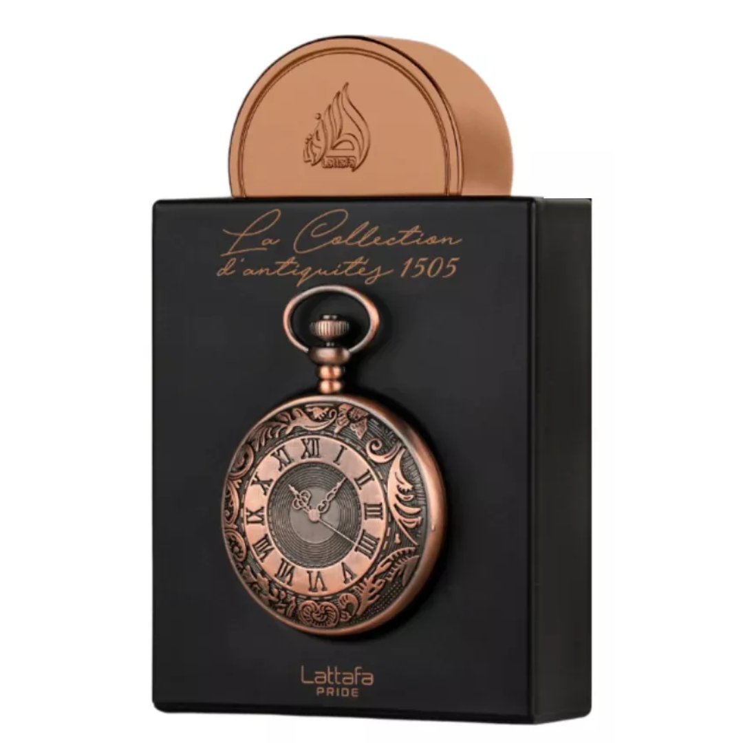 La Collection d'antiquités 1505 de Lattafa Perfumes é um perfume Aromático Frutado Compartilhável. Esta é uma nova fragrância. La Collection d'antiquités 1505 foi lançada em 2023. As notas de topo são: Cereja Preta e Açafrão. As notas de coração são: Olíbano, Osmanthus e Amyris. As notas de fundo são: Notas Balsâmicas, Madeira Guaiac, Nagarmota ou Óleo de Cipriol e Styrax.